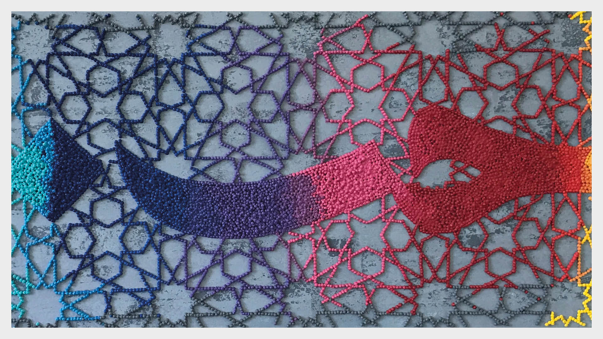Sacred Flow2022 Sacred Flow is a beautiful fusion of Islamic art and a modern expression of colour, where sacred Islamic geometry, with its star-like, repeating patterns, comes alive through a vibrant spectrum of hues. In the lower half, the colours cascade in vertical lines, like rainbow tears or a rainfall of light flowing from within the intricate patterns. This flow of colour evokes a sense of release and liberation, symbolising the soul’s journey from unity to multiplicity and back again. Sale Price: £3600.00 |